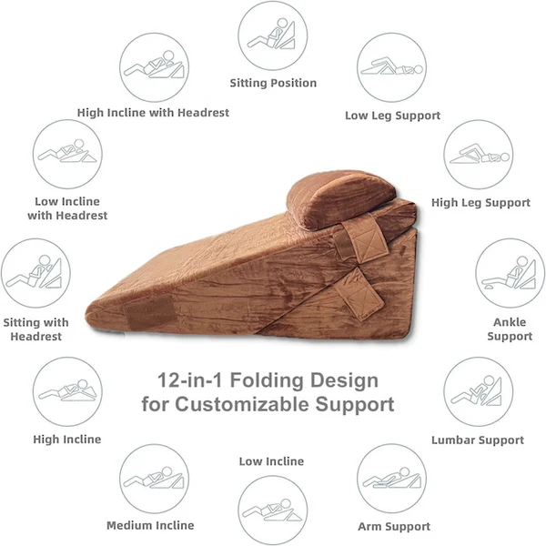 - MULTIPURPOSE 12 in 1 DESIGN : Foldable and adjustable design to elevate your head, support your back or raise your legs. Back support pillow for bed. Adjustable for use as a 12 inch high wedge or 9 inch pillow wedge for sleeping. Also used as a sleep apnea pillow, anti snore pillow, bed rest pillow or back pillow for sitting up in bed. The spacious dimensions of 22'' depth x 22'' width also provide a relaxation area that enhances bed quality.