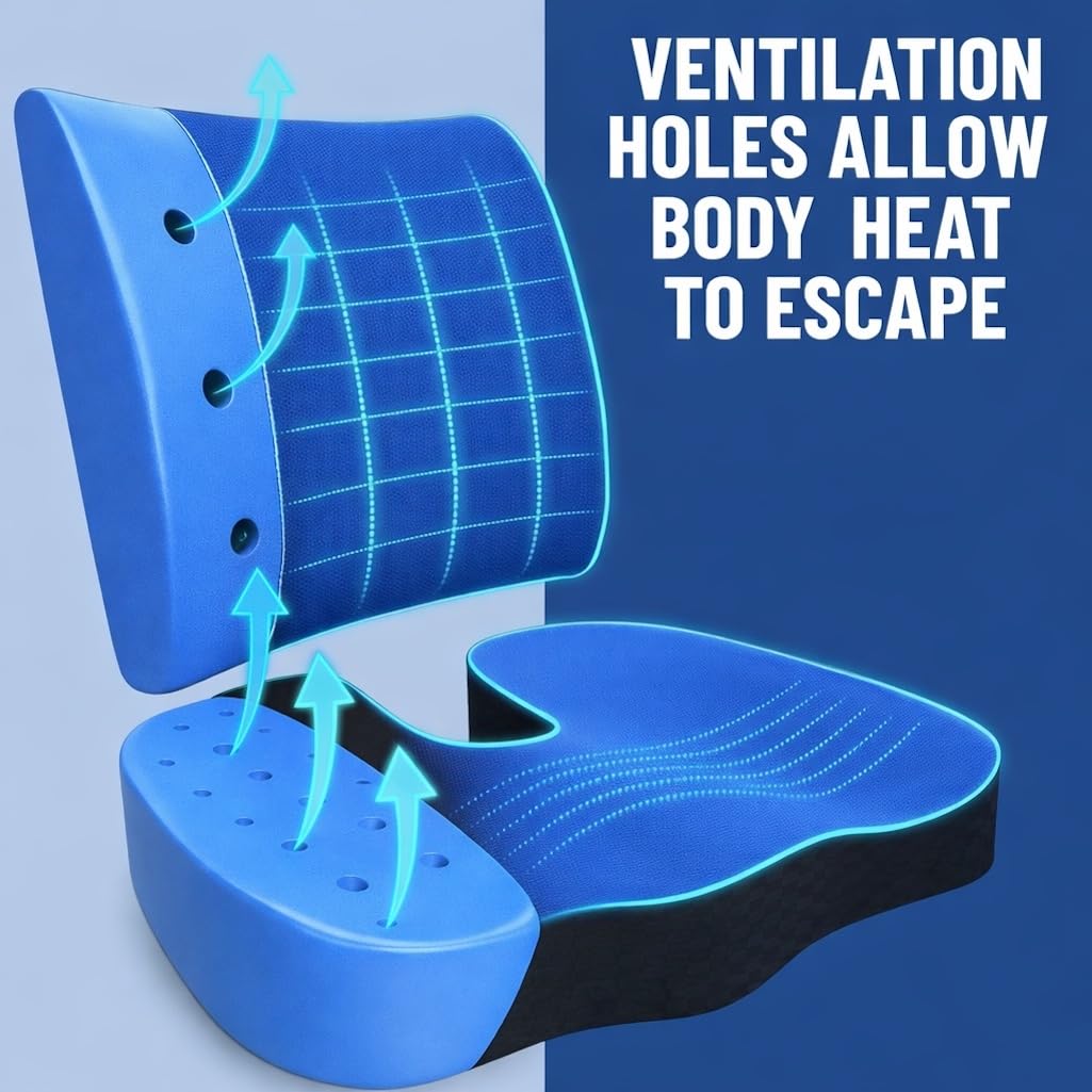 - ✅ 𝗖𝗢𝗢𝗟 & 𝗖𝗢𝗠𝗙𝗬 𝗦𝗘𝗔𝗧𝗜𝗡𝗚 𝗔𝗟𝗟 𝗗𝗔𝗬 : Advanced ventilated memory foam with airflow holes promotes continuous air circulation to reduce heat build-up. Enjoy a noticeably cooler, fresher sitting experience during long office hours, travel, or relaxing at home.