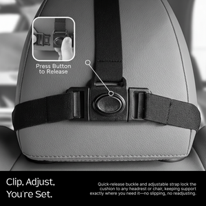 The pillow has an adjustable strap and can be positioned up or down on your headrest to match your neck height perfectly.