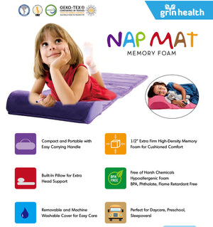 CONSTRUCTION: The memory foam nap mat pad with attached removable pillow is constructed of premium CertiPUR-US certified flexible polyurethane foam - 1/2-inch thick
