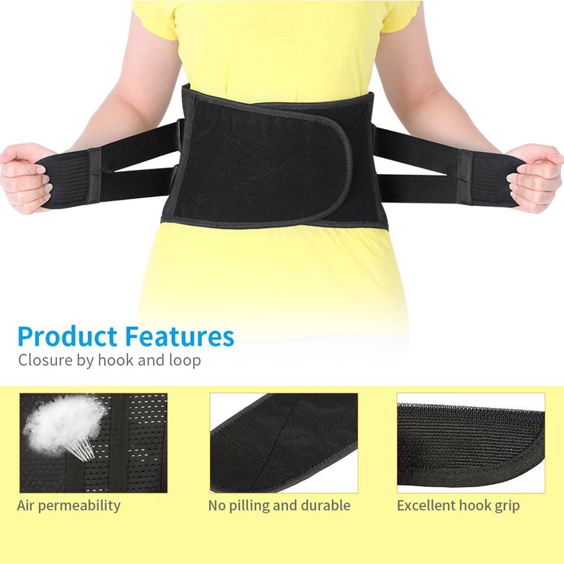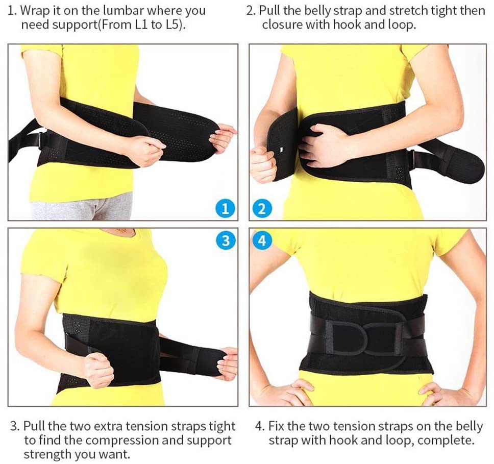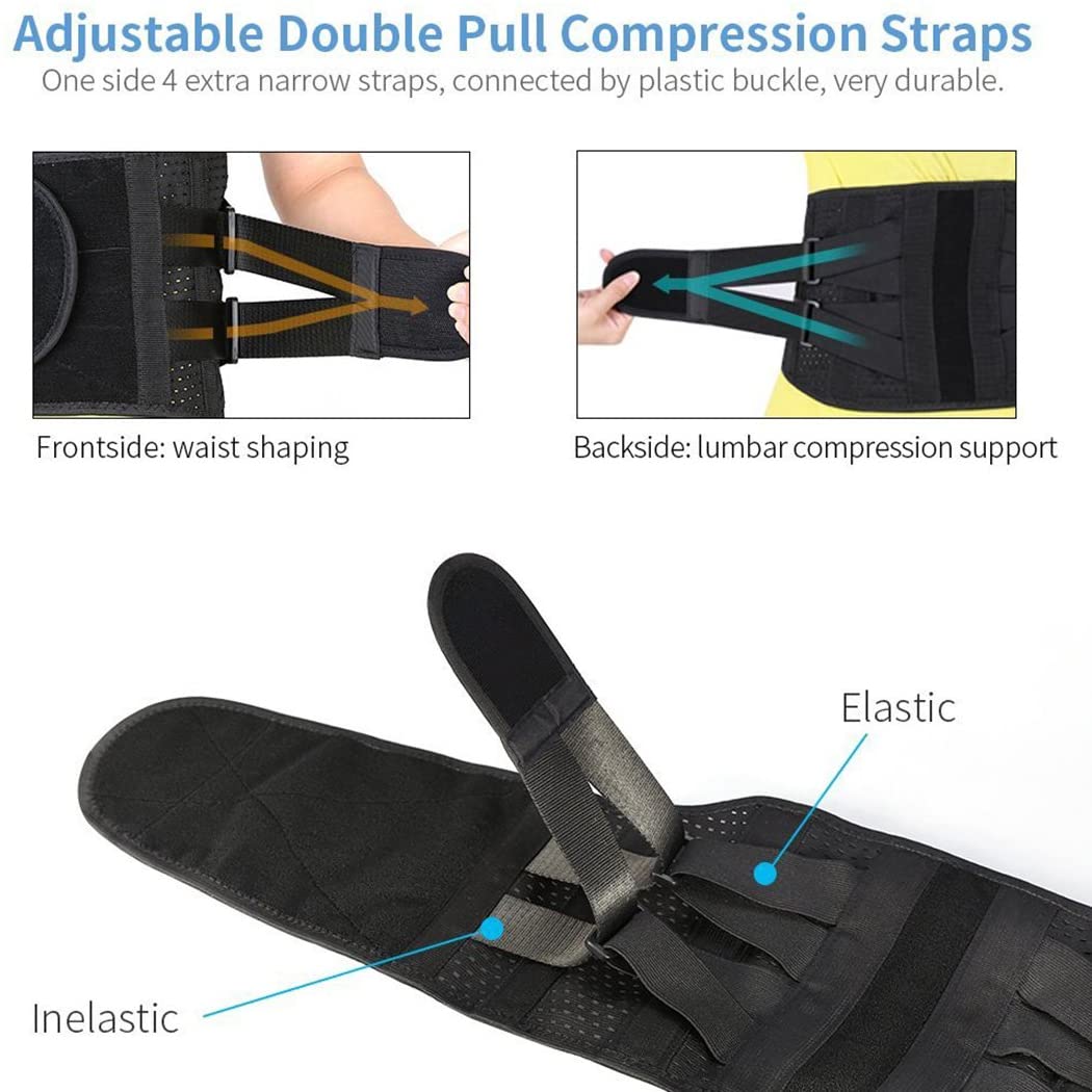 - 【PREVENT BACK INJURIES】Back support with 2 elastic straps are designed to add extra compression around lower back to prevent back injuries from weight lifting, long time standing or sitting, doing housework, working, etc. Relief waist muscles ache, disc herniation, sciatica, scoliosis etc when wearing the back belt.